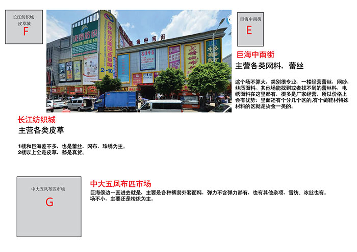 針織:可以去AB區(qū)去找,那里整個(gè)一片都是。條紋,花色,凈色,都有。其中找凈色的可以去F區(qū)**大街那,大屏幕底下從泰森布業(yè)開始,那一排都是做針織的。且都有現(xiàn)貨。AB區(qū)有兩個(gè)停車場,有發(fā)往廣州周邊加工廠的各種車隊(duì)。
