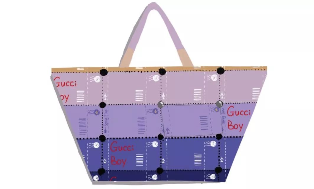 以郵票以齒空相連成為整體為設(shè)計(jì)思路,以當(dāng)季流行色紫橙漸變?yōu)橹饕渖?。這是由許多明信片相連組成的紋樣,明信片記錄著遠(yuǎn)方朋友祝福、思念和美好,而隨著微信、QQ的沖擊,越來越少人會想到寫信,這是對從前那個很慢的時代的追念。而明信片上隨機(jī)出現(xiàn)印有“Gucci Boy”的字符,是時下社會風(fēng)氣衍生出來的價值觀,無論正確與否,都值得我們深思。