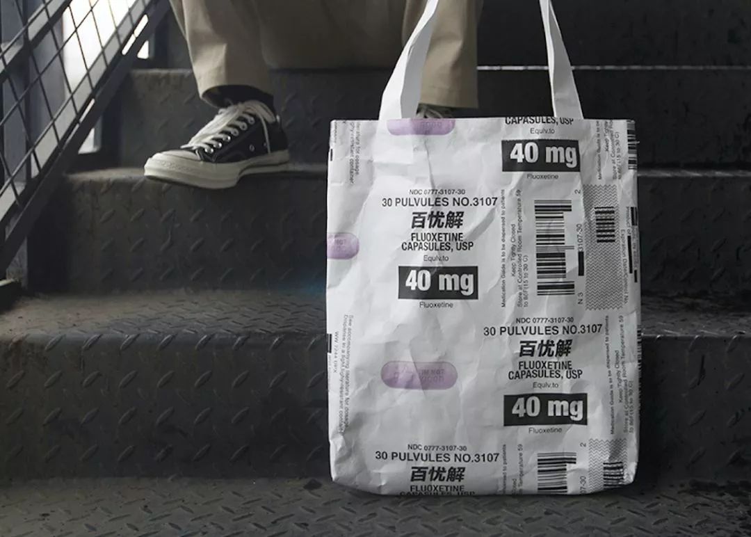 百憂解是一種抗抑郁的藥物,設(shè)計(jì)師從網(wǎng)絡(luò)“喪文化”提取關(guān)鍵信息,印刻在藥丸圖案上,表現(xiàn)年輕人對現(xiàn)實(shí)生活的一種自嘲態(tài)度。